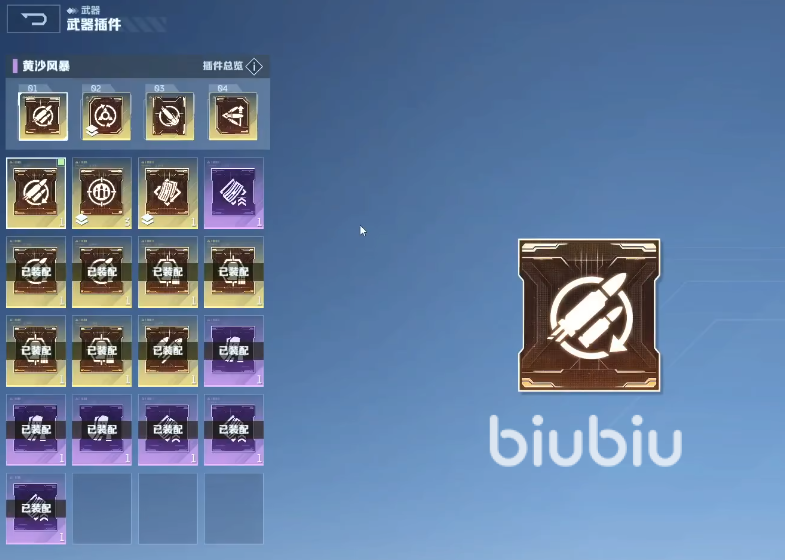 每个武器可以装配4个插件,适合黄沙风暴的插件有:1、快速填装,本身武器就有自动装弹的技能,装配了这个插件能进一步提升武器的换弹速度;2、技能增幅,这个插件能帮助提高武器的射击攻击能力;3、蚀速弹夹,既能提高武器攻击能力还能降低换弹速度;4、临界射界,增加武器的远程伤害的输出能力。