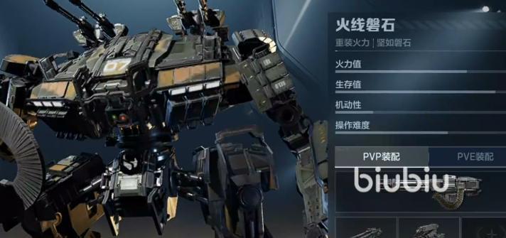 火线磐石,仅是从这个名字就不难看出它大致是什么类型的机甲,正如大家所猜想的那样,它是重型突击定位的机甲,有着极高的防御和范围伤害火力,非常适合在前面抗伤害并提供火力压制。