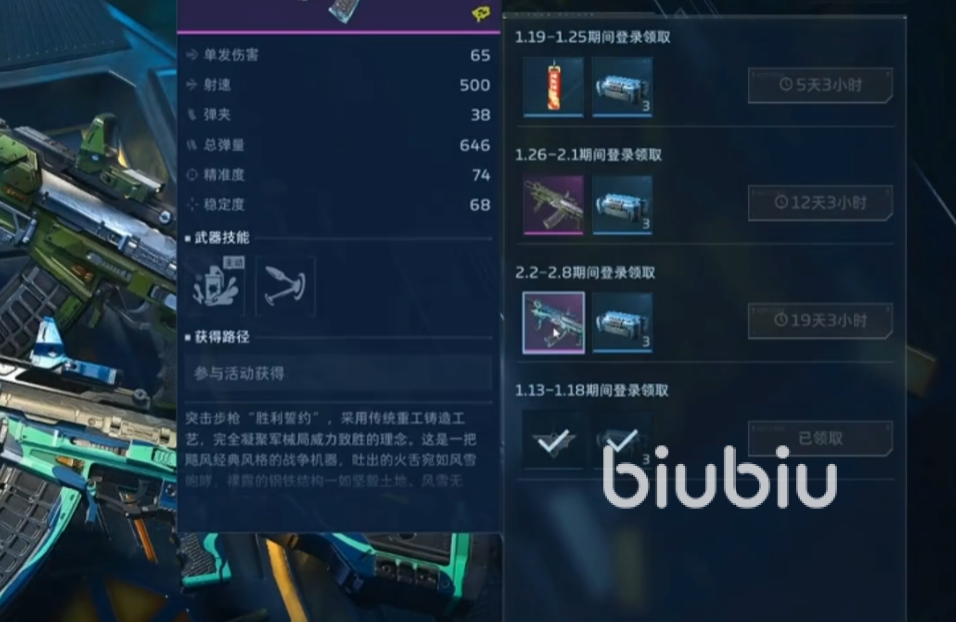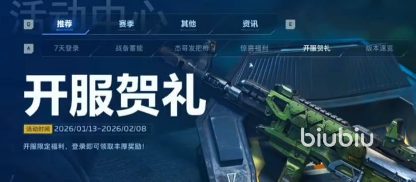 首先开服贺礼是游戏中的一个主要活动,主要持续时间为1月13号~2月8号,在这期间登录先获得一把紫色武器——胜利誓约,作为一把突击步枪,拥有中倍镜,可以进行弹射和瞄准,造成不可忽视的伤害。技能更是可以造成爆炸伤害,方便清理周围的小怪。