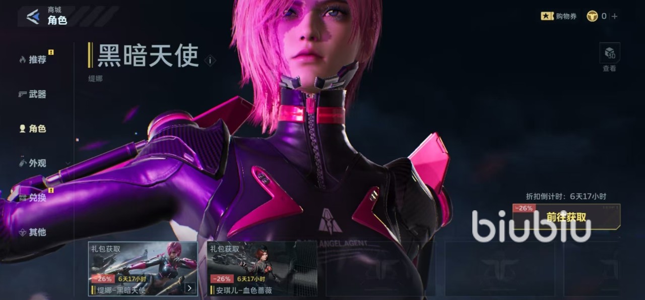 点击进入到商城选项,在商城中找到角色,就可以看到当前两个角色礼包,其中一个就是缇娜黑暗天使礼包,直接购买就可以获得,现在购买还有折扣价,原价38800点NZ点,现价只需要28800点,拥有26%的折扣,所以现在入手最为划算。购买礼包之后,除了可以解锁该角色之外,还可以获得其他赠品,例如头像刀尖,底座触控台,立绘黑暗天使和背景粉墨杀机等。