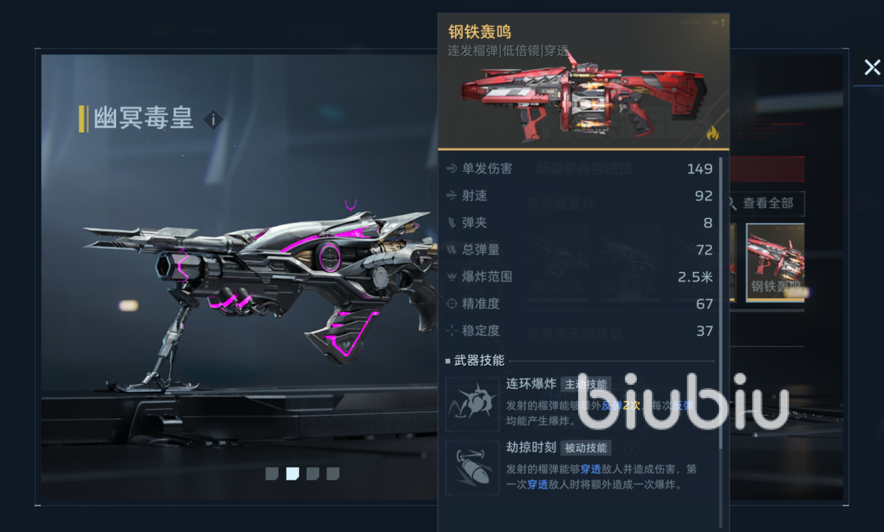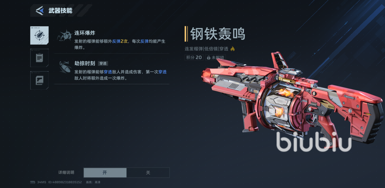 钢铁轰鸣这款武器只要玩家能坚持7天签到即可领取,可以达成玩家们人手一个的金色武器,这是一把火元素的武器,主动技能上能反弹榴莲弹,且每次反弹伴随范围爆炸,被动技能上可以穿透敌人造成元素伤害,第一个穿透目标还额外触发一次爆发,可见其技能特点主要是穿透力强,在单发伤害和弹夹数量略显不足,想要装配的话最好也就是在这两个方面。