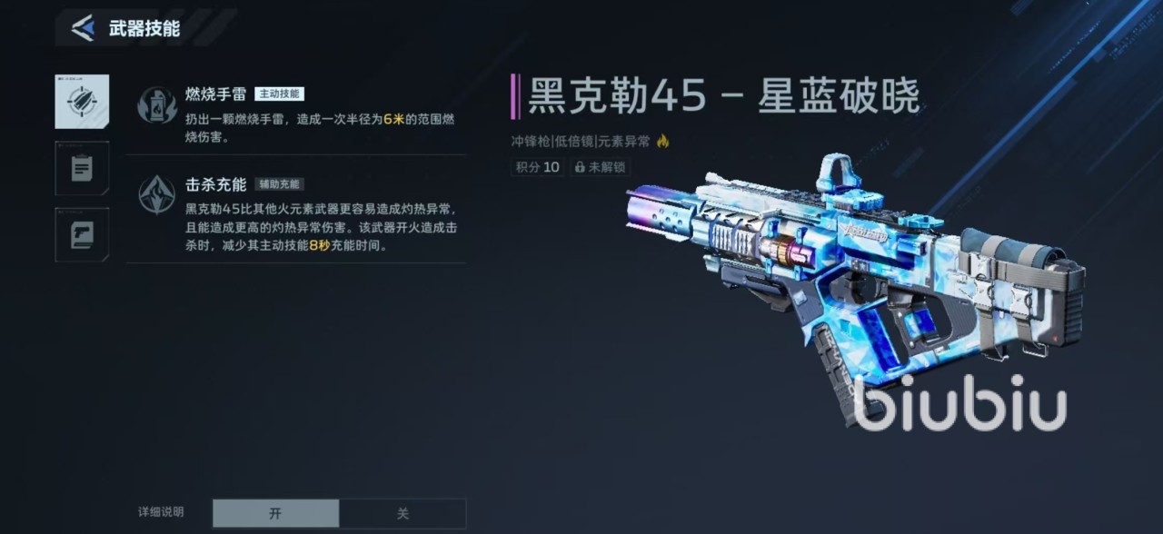 黑克勒45星蓝破晓在外观方面采用了比较科幻的蓝色涂装,它依然属于一款冲锋枪,在属性方面,单发伤害31,射速750,弹夹容量45发,总弹量900发,精准度71,稳定度67。主要有两个技能,第一个燃烧手雷,可扔出一颗手雷造成6m半径的范围伤害。还有一个技能是击杀充能,这款武器比其他的火元素武器更容易造成灼热异常效果,可以造成更高的灼热异常伤害,开火造成击杀时,减少8秒钟的主动技能充能时间。