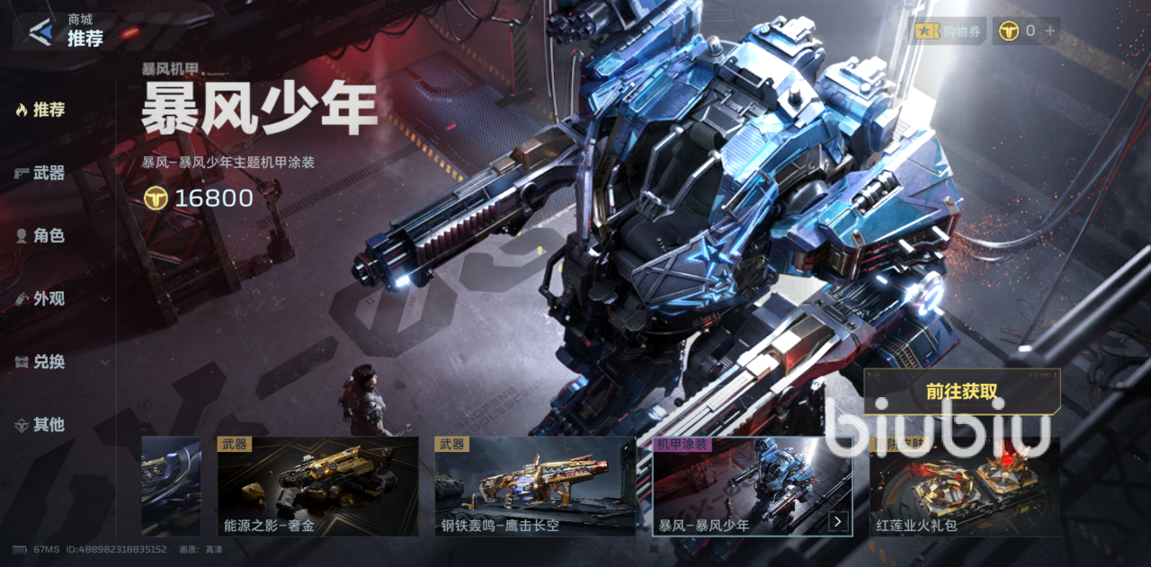 通过游戏的图鉴中可以了解到目前有3个机甲类型,2个机甲涂装类型,在涂装上有暴风机甲-暴风少年和火线磐石-陨铁两个。不过就当下游戏进度而言,只在商城上推出了暴风少年外形涂装的暴风机甲,这个机甲的售价为16800NZ点。