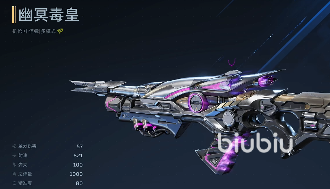 幽冥毒皇的射速是比较快的,能在短时间内对敌人造成大量伤害,并且它的独特之处是被动能让该枪械在机枪和榴弹枪之中进行切换,在机枪模式下每命中敌人35次,就会恢复1枚榴弹;
