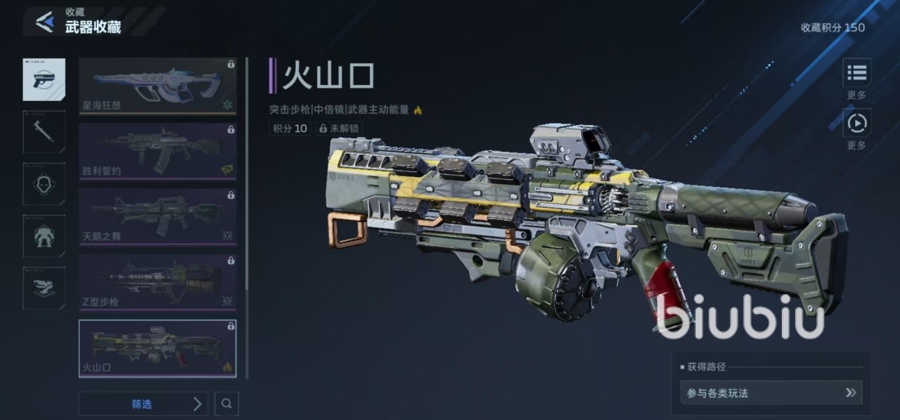 星海狂想搭载了低倍镜,具有动态适应性能够快速捕捉动态敌人,精准打击弱点,辅助星海狂想技能,可以打出海量伤害。还有动态射速能力,开火后速率会跟随开火时间线增长,这样在面对首领、精英或者是大范围持续对抗中,能够越打越快越战越勇,成为战场的刷分神器。同时自身开启主动技能后还具有召唤冰锥对敌人造成伤害,提升射速以及射击不消耗弹药的能力,这样就不用担心续航。除了星海狂想之外,另外几款武器中小编比较推荐的是火山口。