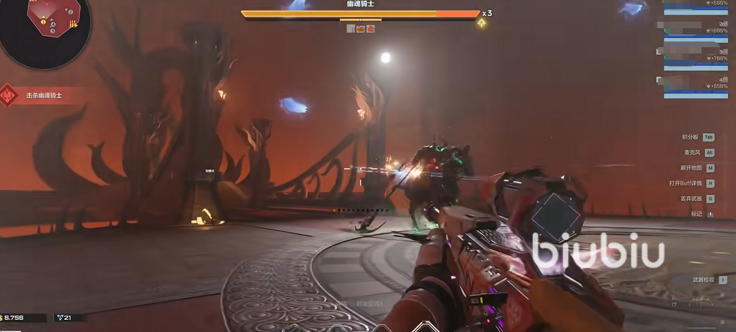 幽魂骑士残血的时候会有红色虚影,这个时候直接在场上进行大刀斩击,伤害特别高,建议大家全部躲避,等待boss变成原本形态继续输出就可以了,瞄准头部扫射会更快。
