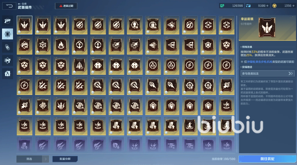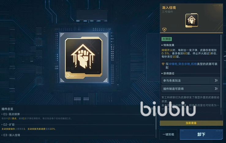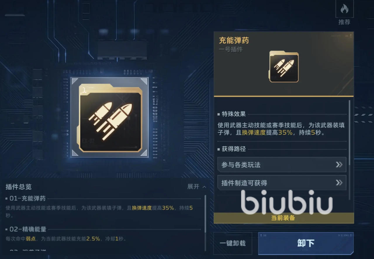首先推荐的金色插件是充能弹药,是大部分武器的核心插件,兼容性极高,可以压缩换弹的时间,缩短火力输出的真空期。该插件的获取方式也比较容易,通过主线推进以及日常挑战,还有一些限时活动任务获取。