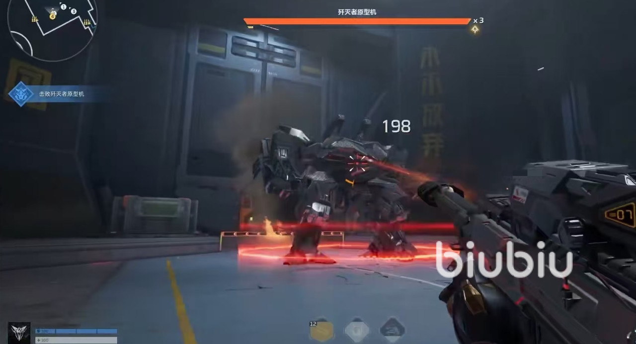 抵达最顶端平台后进入,就将面临这个副本中的boss歼灭号原型机。这个boss机动性很强,会进行传送后突脸攻击,本身也拥有机枪,可进行远程攻击。不过boss传送有明显的前摇,如果距离比较近,看到之后立即后退。每当boss进行跳跃时都会伴随着光波攻击,这时需要用跳起方式来躲避。成功打掉韧性后集中攻击弱点。boss向天发射绿色物体时,需要注意地面上的绿色装置及时破坏。BOSS还会召唤出无人机,需要尽快消灭,也会向前方发射弹幕攻击,利用二段跳躲避。