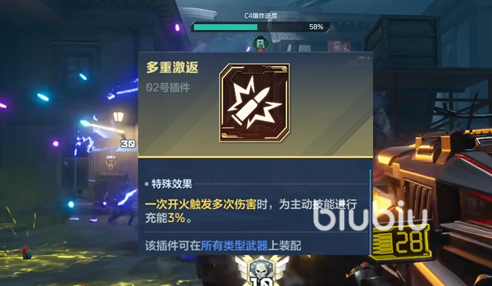 整个搭配的核心是2号插件多重激返,该插件的特点就是一次开火可以触发多次的伤害,并且还可以给主动技能进行3%的充能,因此打群怪的时候效果非常可观。如果大家没有多重激返,那么可以先用扩容代替。