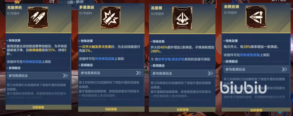 有些小伙伴或许会疑惑,为什么有的插件看起来不错但是不用,比如弱点续弹,是需要打弱点的,很难触发,打不中就不能补弹药,除非技术很高的玩家,不然不推荐大家带这个。超载弹夹没有办法搭配流星雨,流星雨耗弹药很快,所以搭配超载弹夹的话,到时候子弹用完还是需要换弹,并且还容易打空,不如充能弹药来的效果好。渐稳连击虽然打起来会稳一些,但是用处不大,所以也不推荐大家带。