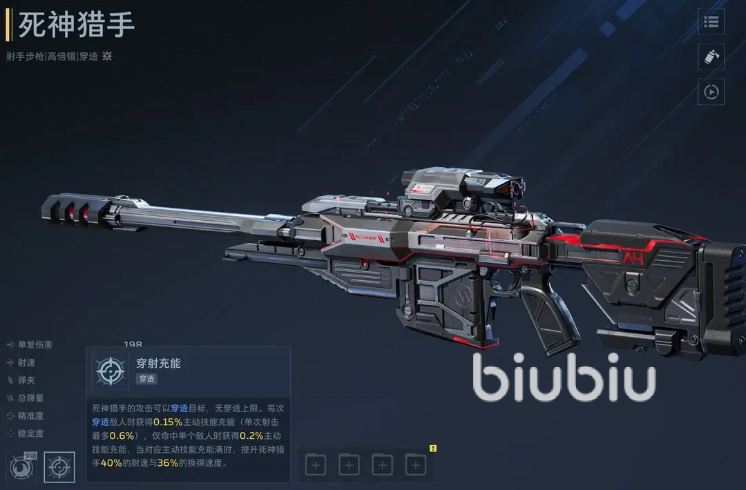 死亡猎手的综合强度很高,用途也比较广泛,主动技能开启之后,角色会进入狂热状态,这个时候能量调试直接充满的,在此期间的输出不会耗费弹药,并且射速也会提升,直到能量耗尽结束。该武器的被动强力弹药可以6层穿透,并且伤害不衰减,每次命中5个目标,还可以补充10%的弹夹容量。若被动是在能量激活的状态下,那么还会提升58%穿透伤害加成,层数越高伤害越高,最高可以达到98%。