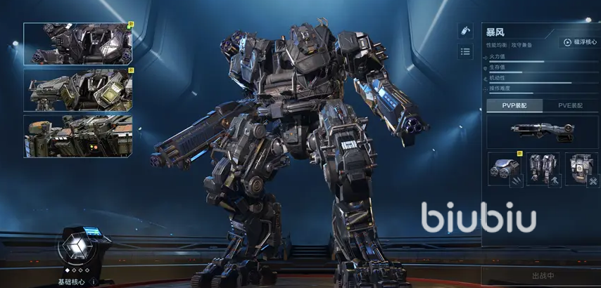 在机甲的选择种类方面,暴风机甲是非常不错的选择,作为均衡型选手,可谓是攻守兼备,能适应大多数情况,是新手熟悉机甲操作和战场节奏的好选择,其武器可装备机枪、冲锋枪及步枪,不同武器在伤害、射速、载弹量等方面各有特点,战术挂件更是会直接影响局内机甲的主动技。