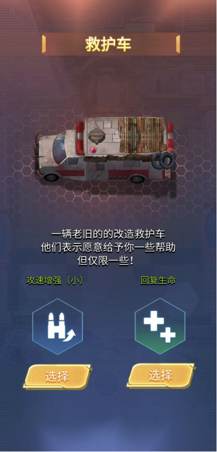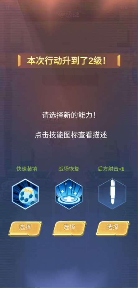 每次升级都会有三个可以选择的技能给我们,这是在副本推图过程中的关键,比如下方的三个技能图标,最开始还是选择装填方面的升级,这样后续比如冰冻或炙热都可以受益,增加射击的前方向或连续射击也很不错。再就是每隔几关的救护车,如果我们血量不充足,还是要回复生命。