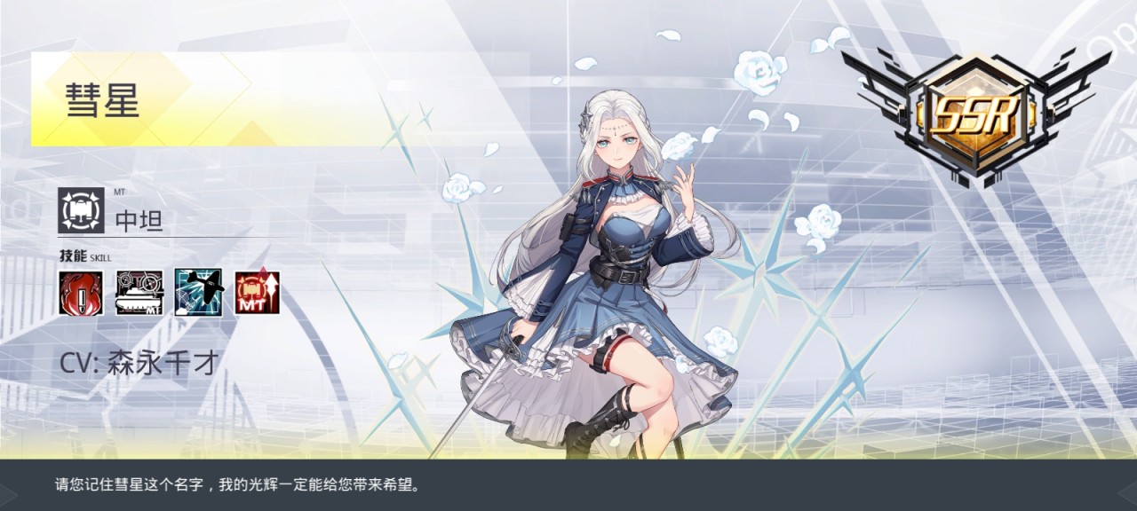 说完了,重坦SR品质的中坦也是不能错过的,彗星就是一个非常不错的中坦,这个游戏角色的建模非常漂亮,一头银发身材纤细。在碑上以深灰蓝色为底的衣服,显得非常的英姿飒爽,特别的切合他的角色特性,作为一个中塔,他的输出能力是相当不错的,虽然防御能力抵不上重坦,但是他的各项技能造成的伤害都非常的。