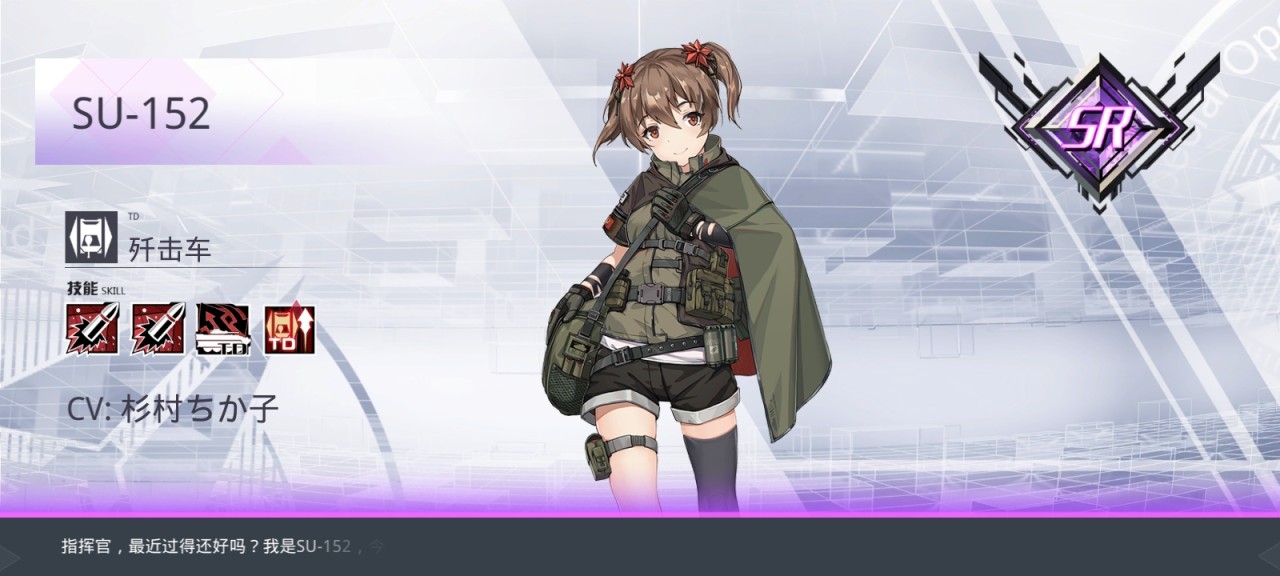 SR中的歼击车数量不多,SU-152就是一个高品质的歼击车,玩家如果抽到这个角色的话,一定要把它用起来,因为它的强度属性都非常不错,培养起来的话能够给玩家带来不少的帮助。