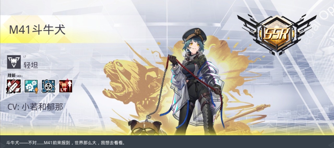 再有就是轻坦,在轻坦当中小编最喜欢的SSR品质的角色是M41斗牛犬,轻坦的优势正在灵活,攻击速度快,在战场上的使用也比较灵活,而这个M14斗牛犬。在众多心坎中脱颖而出,就依赖于他较强的输出能力。