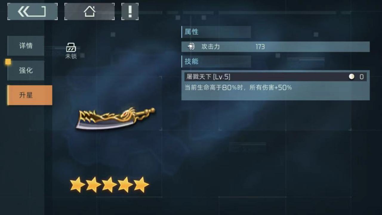 武器升星难度最高,因为游戏当中目前并没有获取武器的有效途径。玩家们只能够通过活动或者一些特殊关卡、副本才能够得到武器奖励。所以平时在进行游戏的时候,大家就要留意每日的活动任务和一些特殊关卡的刷新。只要成功得到的相同的武器,就可以进入到武器的详情页面进行升星。
