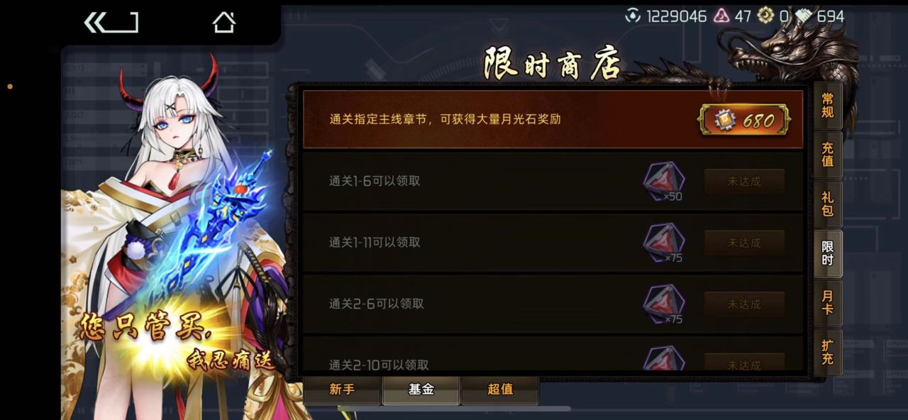 第二个推荐的是68元的基金,在绝大部分的游戏中基金都是属于微氪玩家拿高级货币最好的方式,只要完成比较简单的条件就可以获取大量的月光石,划算极乐,总计有2000以上。