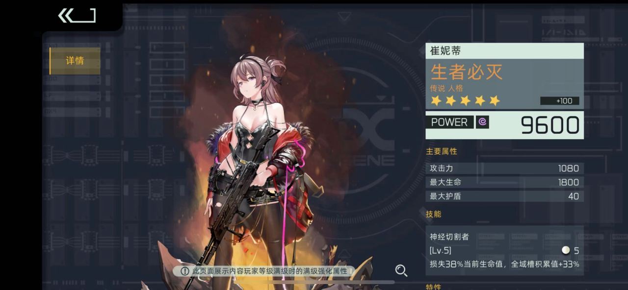 1.主动技能神经切割,消耗掉自己百分之38的生命值,全域累计值增加百分之33,这个技能消耗的能量是5点,通常使用2次搭配上闪避、普通射击、使用技能获取的全域值可以顺利达到百分之百,但是这个时候血量已经比较低了。