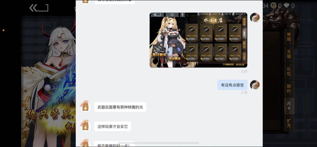 重启条件之二:在咱们的商店中,左边有一个二次元画风的妹子拿着一把网页游戏似的屠龙刀,这种极不和谐的画面必须点击它,点5次之后出现一个画面,重启条件的信封收入囊中!