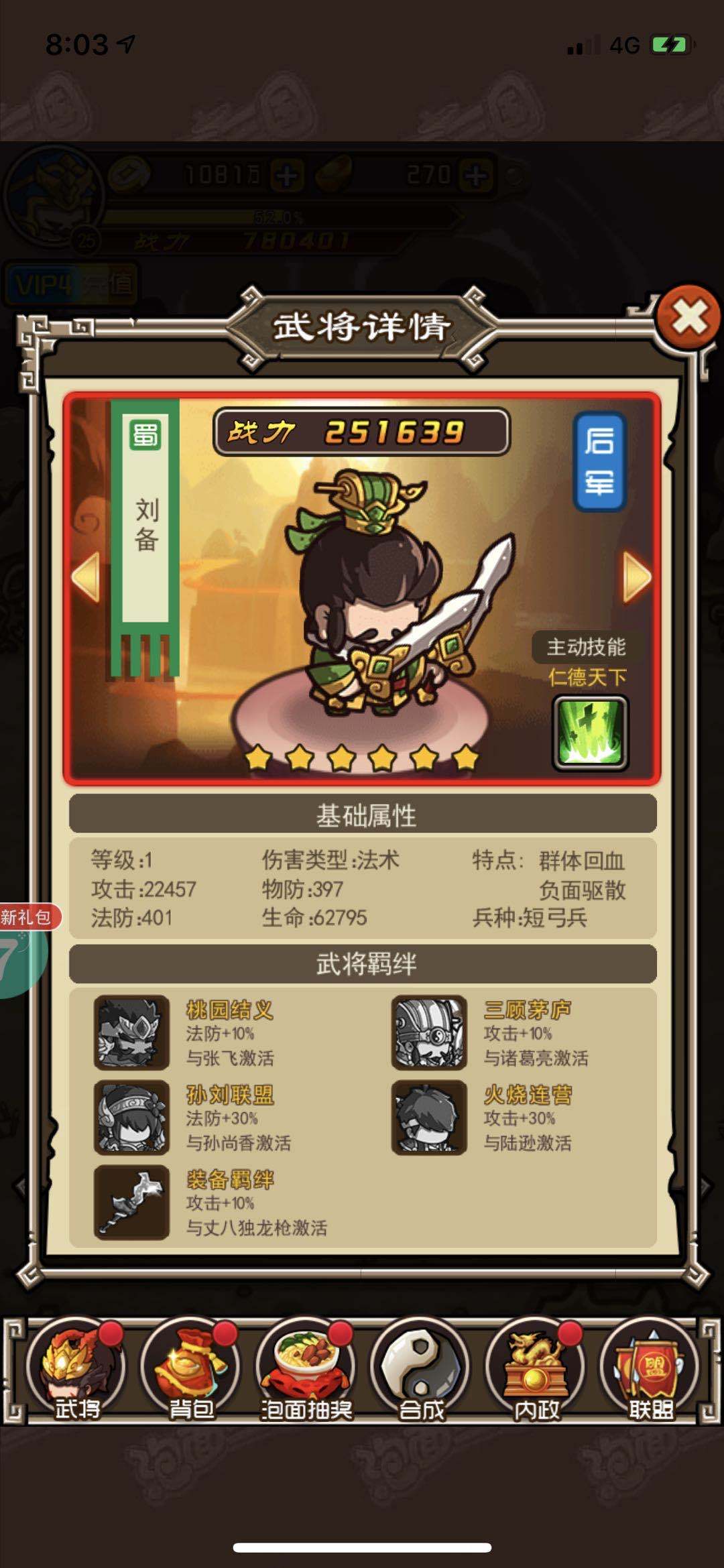 刘备在红色将领阵容里属于一个站在前排的英雄,能帮助自己队友套盾,自身皮糙肉厚的还能帮助队友抵挡敌人的伤害,而且还有一点,刘备和关羽再加上一个张飞能形成羁绊效果,百分比大额增加关羽的各项属性,让关羽的战斗力还能再上一个台阶。