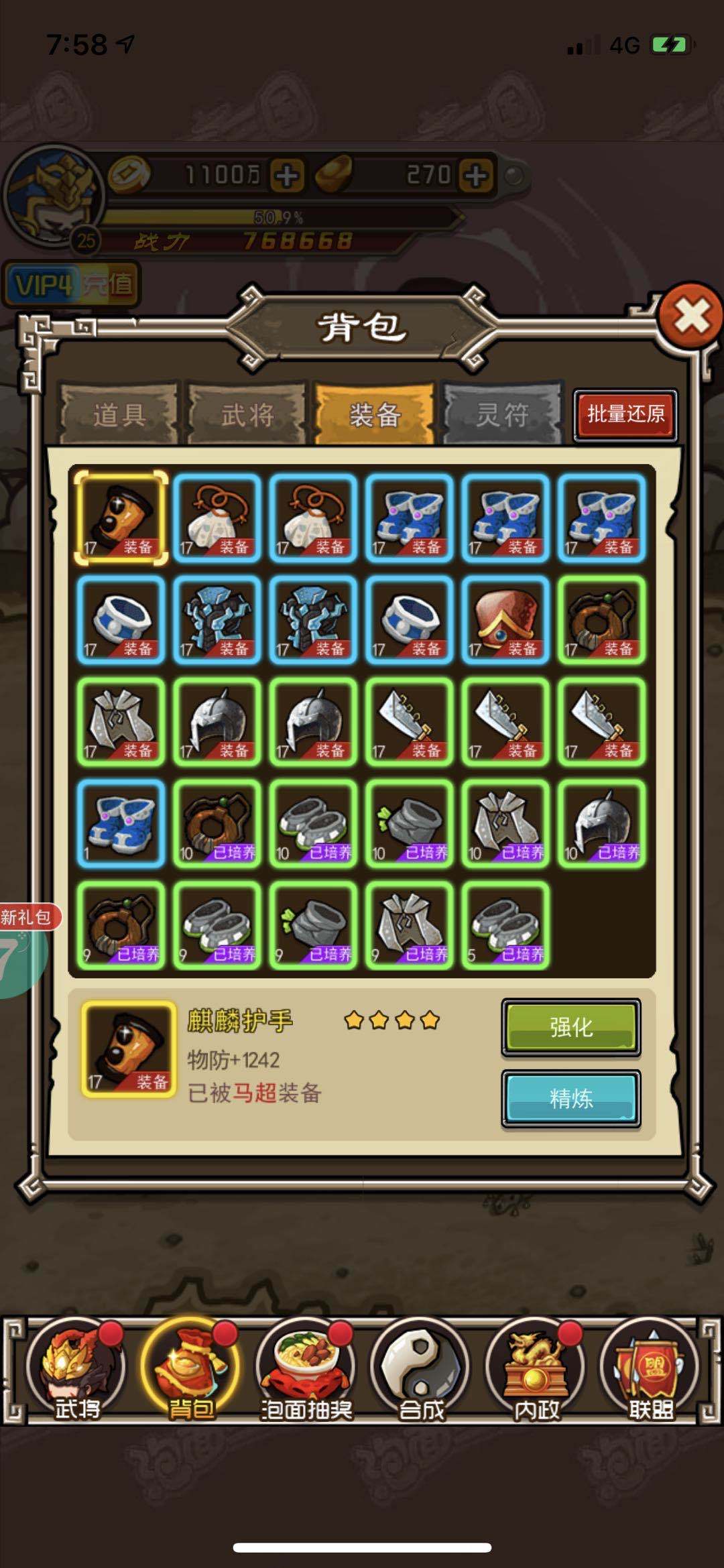 第二点就是要给张角搭配更高等级的装备,装备只是品质好是不够的,还要有更高的等级。装备和武将一样,也是有等级成长度的,等级越高的装备属性就越高,而且武器强化到指定等级还会激活武器强化大师的称号,当所有的装备强化到整十级以后就会激活这类效果,让张角的战斗力更高。