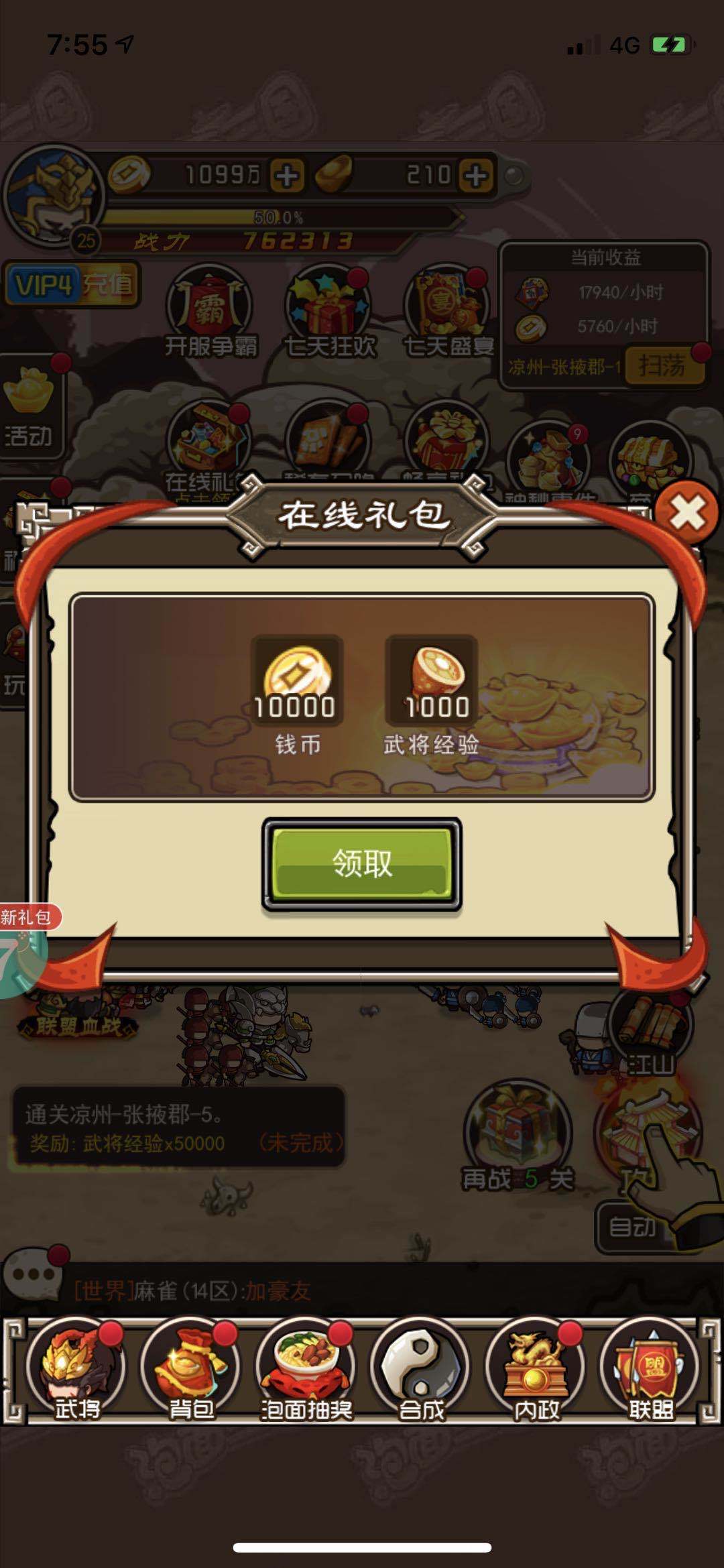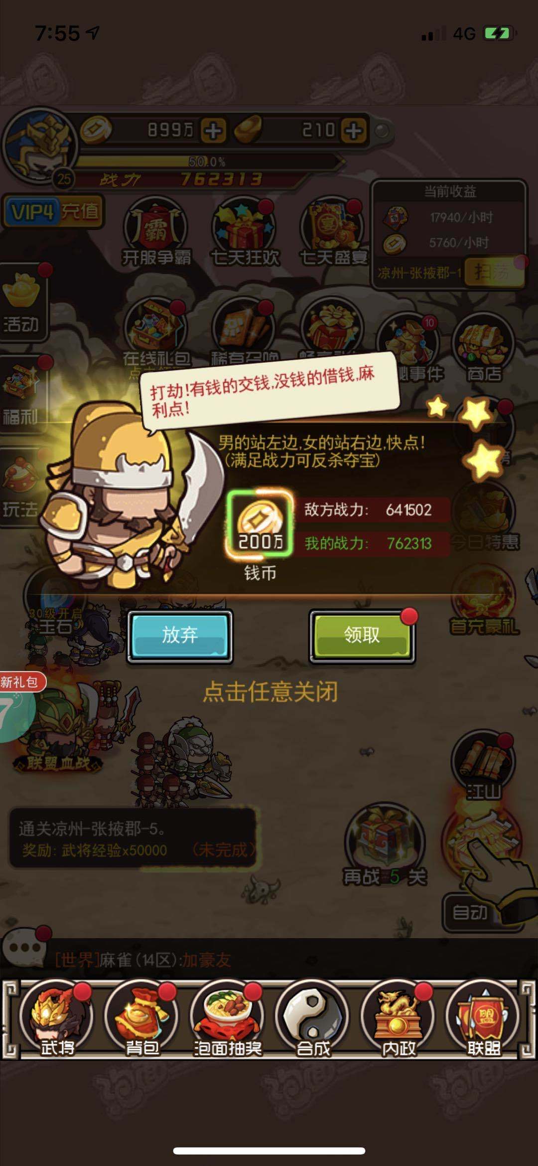 新手任务做完以后,大家要做的是全服的限时任务,限时任务一般是全服的积分任务,排名越靠前的话获取的元宝数量就越多,大家一定要踊跃的参加。最后就是主线任务了,提升自己的实力往后攻打城池也能获取不少的元宝。
