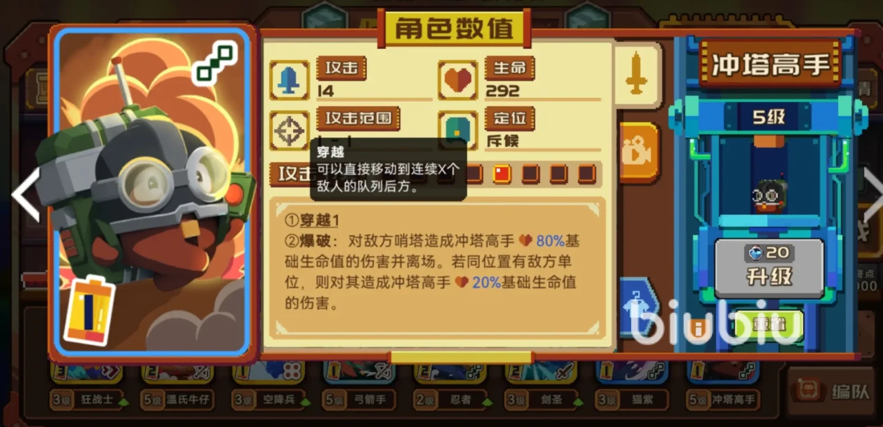炸弹兵本身数值虽然一般,但是爆破和穿越这两个技能联合在一起的话,那么对于防御塔的伤害就会变得很高。同时绝大部分的阻拦敌人都可以让炸弹人穿越过去,它的战略性就会变得非常重要。