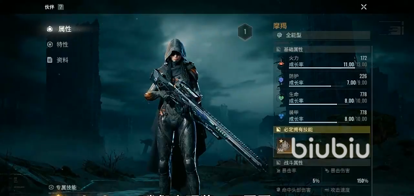又是一个全能型伙伴,同样为最高的金色品质。拥有3个专属技能,战术技“武器超载”,在他拥有6个战术点后,下次攻击会优先选择视野中生命最高的目标,射击造成4次伤害,之后再将战术点清空。主动技“绝对专注”,在接下来的14秒内,命中敌人头部的概率提升30%,攻击速度提升30%。被动技“弱点导航”,每次射击命中目标暴击率提升4%,暴击伤害提升8%,最多可叠加3次,能持续30秒。还有一个专属被动“猛攻”,火力提高100,防护提高150,生命提升500,同时装甲也提高500,副手的转化率也增强0.5%。