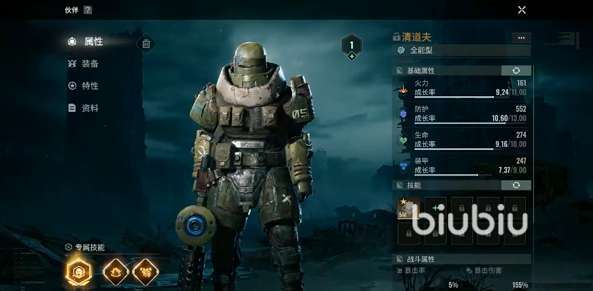 清道夫是个金色品质的伙伴,全能型的角色,基础属性来看各项数值都非常的在线,拥有三个专属技能。战意技能“战吼”,战意值达到上限后发动,恢复自身50%的装甲以及生命值,并在接下来的14秒内伤害减免提升30%,之后清空战意值,战意值是每次进入战斗后慢慢积累的。主动技“震撼打击”,使用后可发射一枚震撼弹,对8米内的目标都造成1800%的伤害,并击晕目标3秒,同时吸引范围内的目标火力14秒。被动技“防护力场”,让伤害减免提升15%。还有一个必带的5级技能“坚守”,能让火力提升100,防护提升450,副手的转化率提升0.5%。