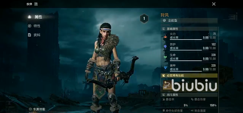 这是个比较擅长使用弓箭攻击敌人的女性伙伴,整体形象看起来非常的帅气,在战斗时也是很飒。战意技“穿林三箭”,战意值达到上限后可使用,发射出连环三箭,每次造成500%的伤害,并使其进入创伤状态,处于该状态的敌人每秒受到100%伤害,能持续14秒。主动技“跗骨藤毒”,发射出带藤毒的箭攻击敌方,受到攻击的敌人承受1500%的伤害,并让敌方进入滕毒状态,在14秒内的每秒都承受200%的伤害,同时射击精准度降低50%。被动技能“蛇毒”,每次射击命中敌人后,有50%概率使其进入蛇毒状态,每秒受到30%的伤害,同时射击精准度下降10%。