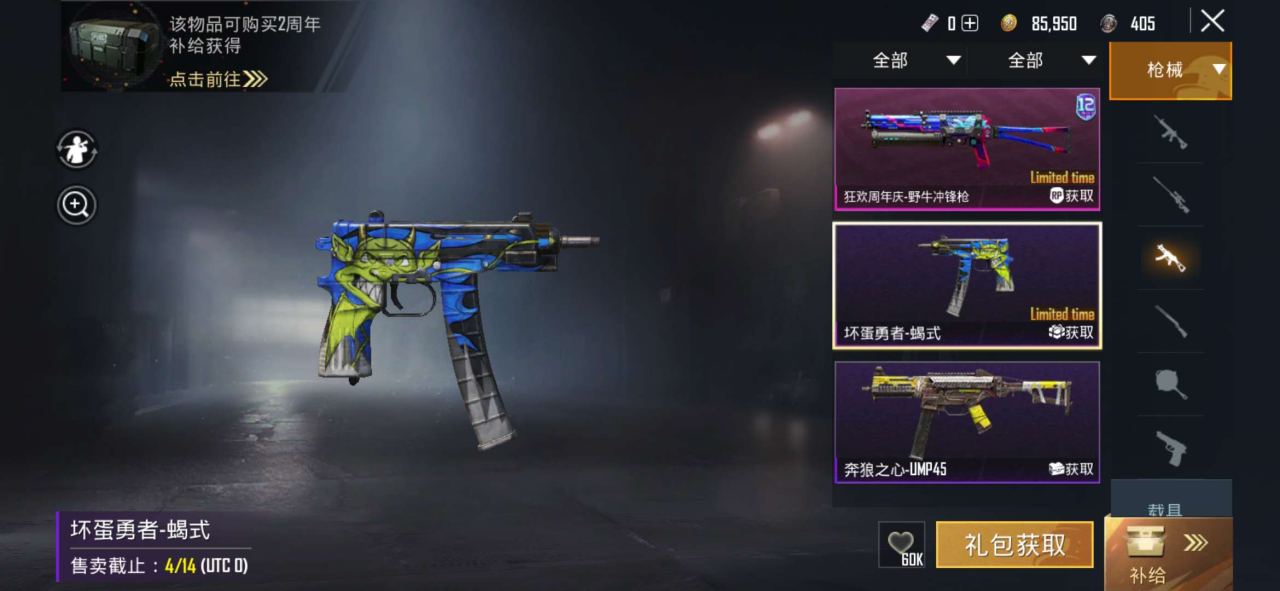冲锋枪拥有狂欢周年庆一款粉色皮肤和坏蛋勇者、奔狼之心两款紫色皮肤,其中坏蛋勇者皮肤是目前2周年活动的产品,过一段时间就会下线,喜欢使用蝎式的玩家千万不要错过了。