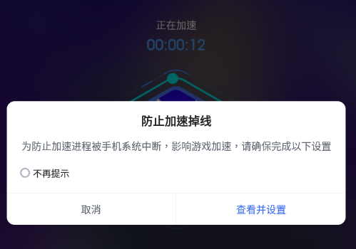 玩家如果是首次进入加速界面,会收到来自系统的如下提示。提醒您对手机进行设置以防加速进程被系统打断,点击“查看并设置”后,根据教程内容逐步完成相关设置即可。