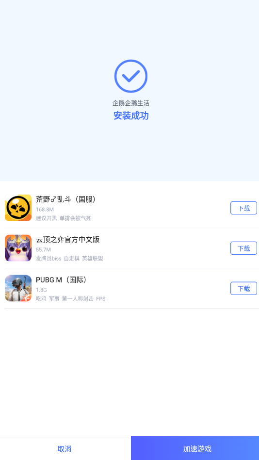 成功下载和安装企鹅企鹅生活以后,接下来就可以用Biubiu给游戏加速了。如果想要立即体验的话,就选择下方的“加速游戏”即可直接启动游戏。如果玩家想稍后再进行游玩,可以先点击“取消”,稍后在biubiu加速器的主界面找到企鹅企鹅生活再进行加速。