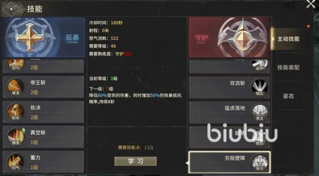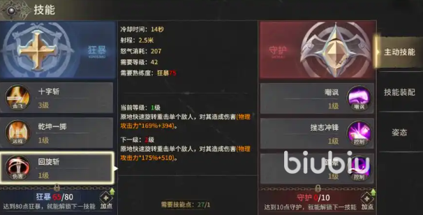 技能上优先升“狂暴斩”、“旋风斩”和“暴怒”,狂暴斩会向着前方斩击,对一条路径上的所有敌人造成物理输出,旋风斩能让自己化身为旋风,对周围敌人持续造成输出,能一次对付多个敌人,暴怒会在积攒力量后,发动攻击造成高额伤害的同时还有概率让目标陷入眩晕。