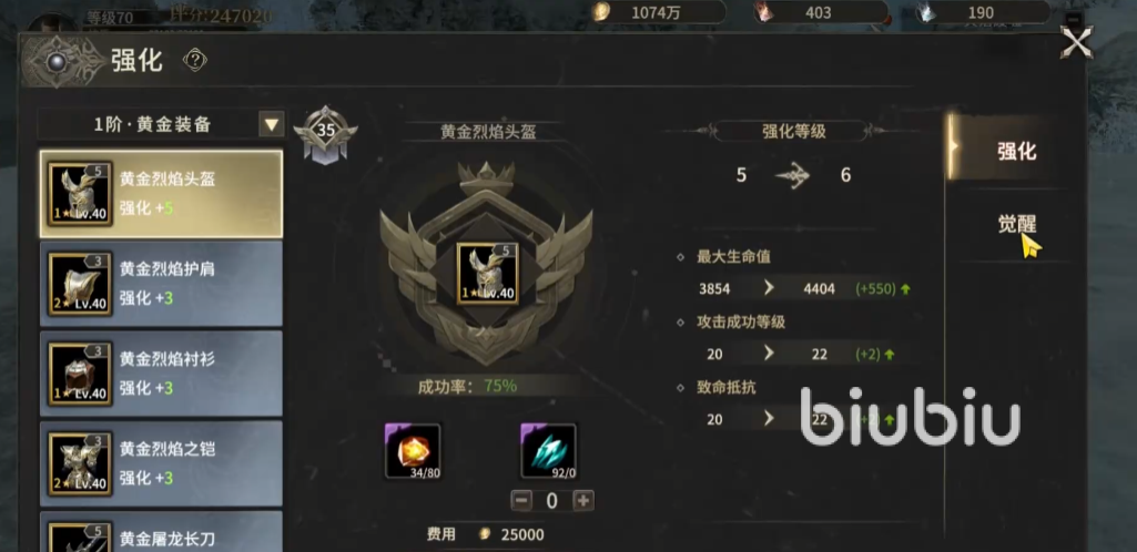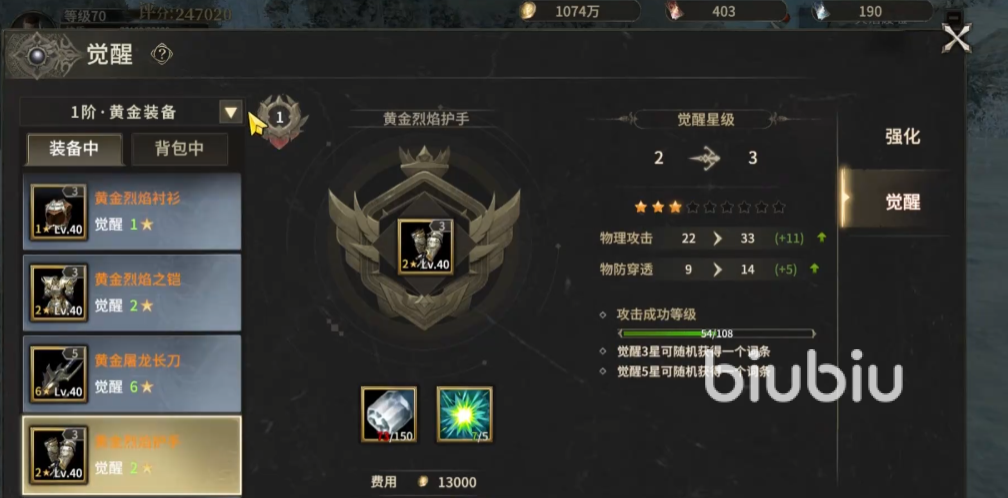 每次对黄金装备进行觉醒,都能增加觉醒的基础属性,且每个装备觉醒等级到1/3/5星时,能获得1个属性词条,词条有独特的属性加成;不同职业可选择更加合适的词条去使用,比如增加攻击力,防御力提升,暴击率提高等。