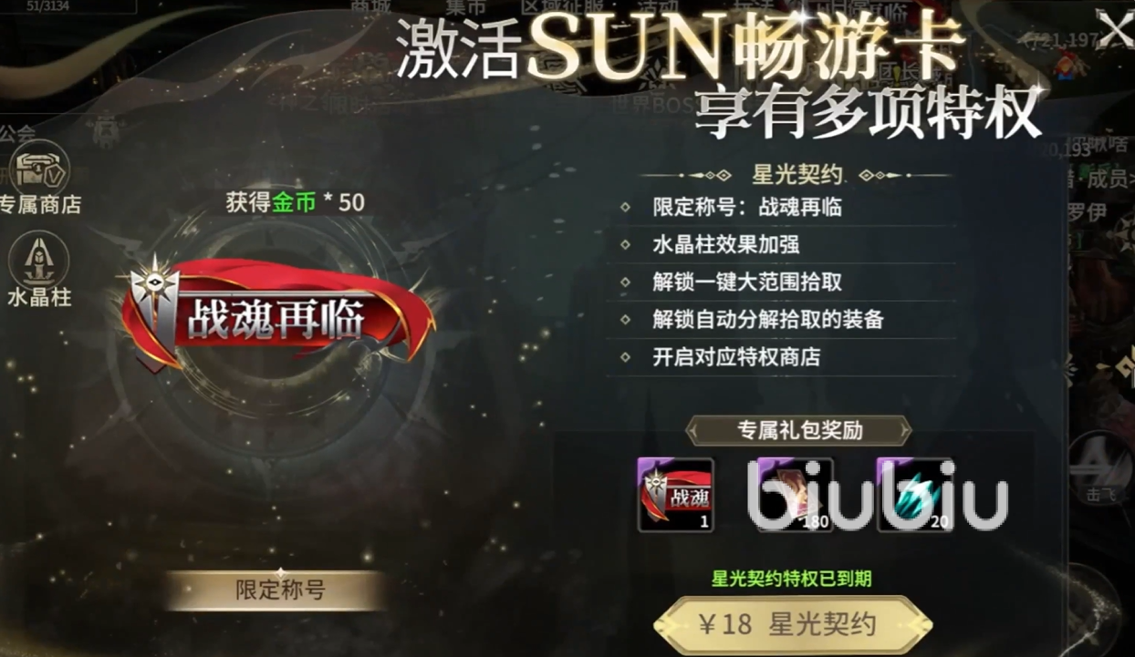 首先这里很推荐大家开启游戏内的特权卡,每个月大概花费18块钱就可以获得星光契约。不仅可以获得专属称号,又可以提升水晶柱的效果;然后又可以解锁一键大范围拾取,这样就能无需频繁拾取周围掉落的物品,甚至还能自动分解;最后又可解锁特权商店,方便购买重要物品。