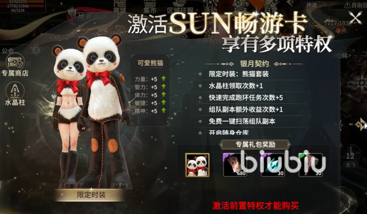 如果大家购买了星光契约之后,又可以解锁另外一个契约,也就是畅游卡。解锁过后就可以获得一套熊猫套装,接着又能够增加一次水晶柱领取机会。然后又可以增加5次快速跑环任务,并且可以额外获得一次组队副本收益的拥有机会;甚至能够一键扫荡组队副本,并且能获得随身仓库。