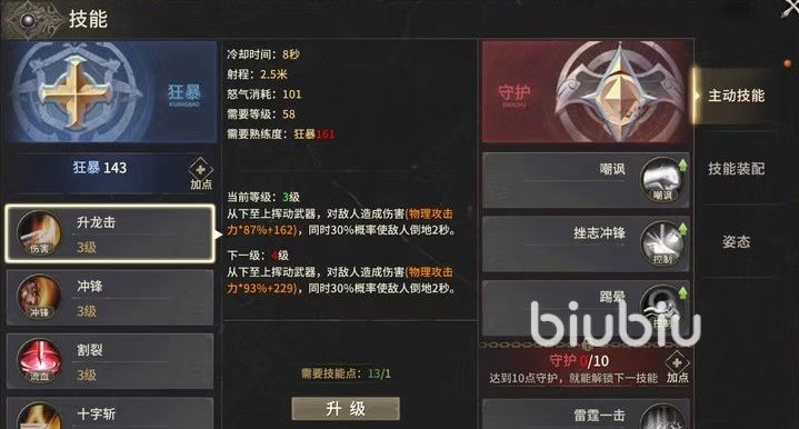 如果选择走守护路线,那么就要做好成为团队壁垒的准备,核心技能是盾击,这是起手技能,可以眩晕敌人,并且嘲讽强制攻击自身,为队友创造安全的输出环境。第2个核心是盾牌格挡,大幅度提高自身的格挡率,减少受到的伤害。第3个核心技能则是生命强化,提高自身生命上限,加强生存能力。