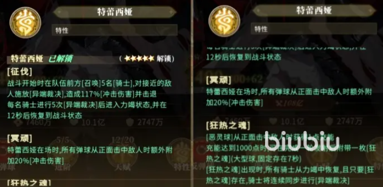 特蕾西娅有特殊的出伤机制,她的“征伐”会在战斗开始时在队伍前方召唤5位骑士,对接近的敌人施放裁决造成117%冲击伤害,进行5次裁决会力竭,等待12秒恢复到战斗状态,她的“冥顽”能在自身在场时,让所有弹球从正面击中敌人时额外附带20%冲击伤;