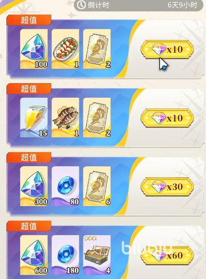 里面有体力药和双倍材料奖励,然后就是一系列的氪金收益也就是角色抽卡资源的礼包了,这些礼包建议是拉满,在全部拉满后接下来是基金和豪华签到的购买,基金优先去买签到的话可以等到完成签到后进行购买。