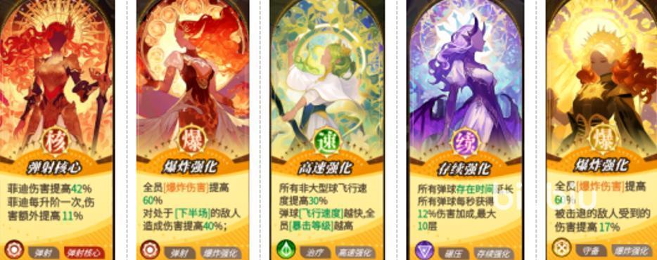 菲迪,主C,是整套阵容的核心发动机,技能围绕着爆炸伤害展开,弹球命中后频繁触发爆炸效果,在清杂和对单的场景中都是有着极强的表现。星座选择射手座,可以提升伤害,并且菲迪的技能生成的脚印还可以频繁触发射手座的召唤物加成,让实际收益进一步提升。幻影球技能推荐同步强化或者熟练发射,前者可以保证前期迅速成型,后者则可以提高发射频率,增加爆炸触发次数。局内女神buff优先弹射核心和爆炸强化,菲迪的升级顺序也是排在第一的。