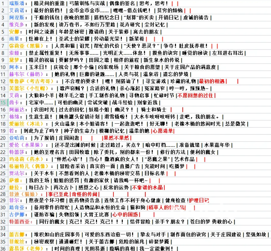 首先精灵间的重逢、弓箭训练与实战、偶像的签名、思考思考指的是瑞斯潘,最好的搭档、金币金币金币、嘿嘿~借点钱吧、贫穷的烦恼指的是艾莉诺,读万卷书,不如行万里路、花卉研究、尘封记忆以及新的发现,全部指维克多。