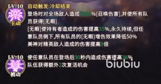 美神的主动技会在登场的时候,对场上所有敌人造成5000%召唤伤害,并让所有的队友都得到无暇,无暇会使得持有者打出的输出提升35%,并且是永久生效,有她在队伍的输出能力会将有质的提升。