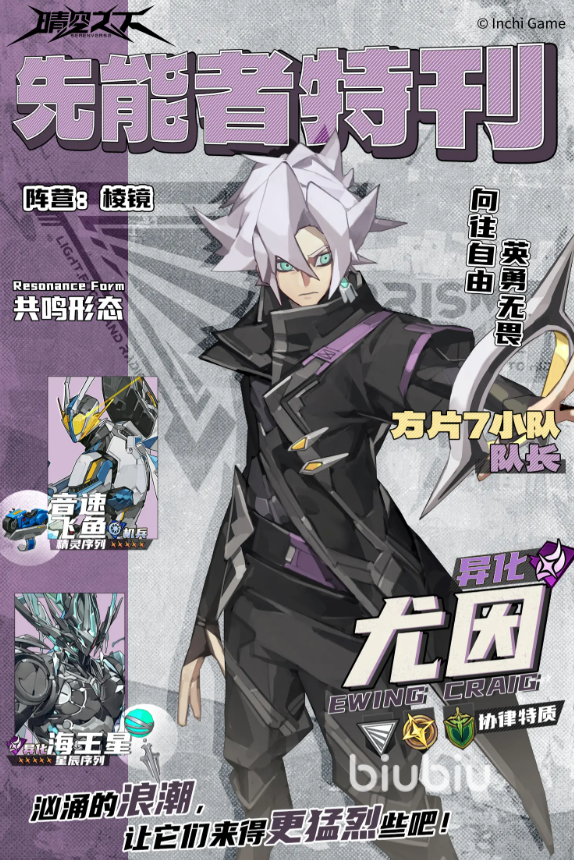 尤因曾经孤身游历世界,在这个期间见证了世界的不公和苦难,但是却并没用磨灭眼中的光,他为了改造世界加入到了棱镜,成为了方片7小队的队长,并将其视作自己最为珍视的“家“,来真诚对待。