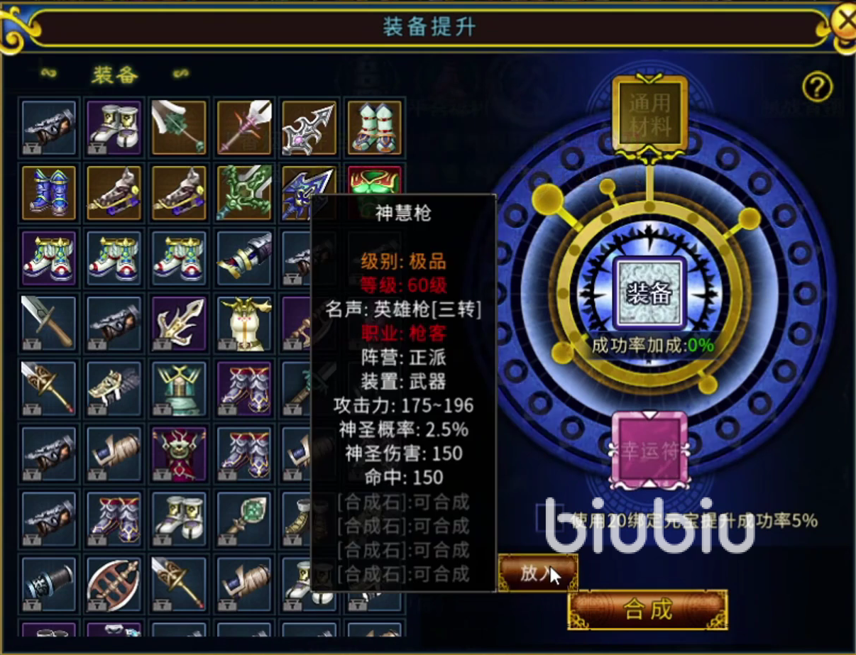 每一件装备通常情况下,可以一次性装配四个合成石。也就是说,每个装备如果想发挥出全部战斗力的话,至少得需要四次合成帮助我们提升战斗力。因此,对于合成石头装配来说,幸运符就是至关重要。毕竟如果在初期阶段装备合成时没有使用幸运符的话,很有可能会被游戏前中期较为难受的合成概率所困扰,继而导致不少装备装配合成时失败,浪费石头。当然,部分玩家们也可以选择用元宝进行提升强化成功率。
