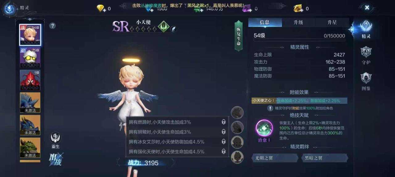 所以大家想要重点培养一个精灵的时候,就可以把他所有的羁绊都凑齐,这样精灵的属性就会非常高,如何选择重点培养的精灵就要看自己的职业了。不同的精灵绝技天赋不同,小天使的绝技天赋就是治愈,可以提高主人的生命值,这一点就非常适合骑士,剑士等近战职业。只要是主战精灵出战,其他羁绊精灵守护就可以了。