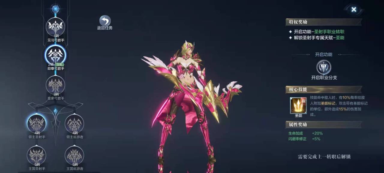射手的两个转职方向是圣射手和巡游者,其中圣射手的转职路径是领主圣射手,王国圣射手和圣殿圣射手。圣射手的专属技能是圣能,大地之力,恩泽。其中圣能可以在击中敌人之后附加圣能标记,攻击带有圣能标记的目标可以获得伤害加成,大地之力可以提升地元素伤害和攻击力附加,恩泽可以在攻击带有圣能标记的目标时候,触发群体治疗。