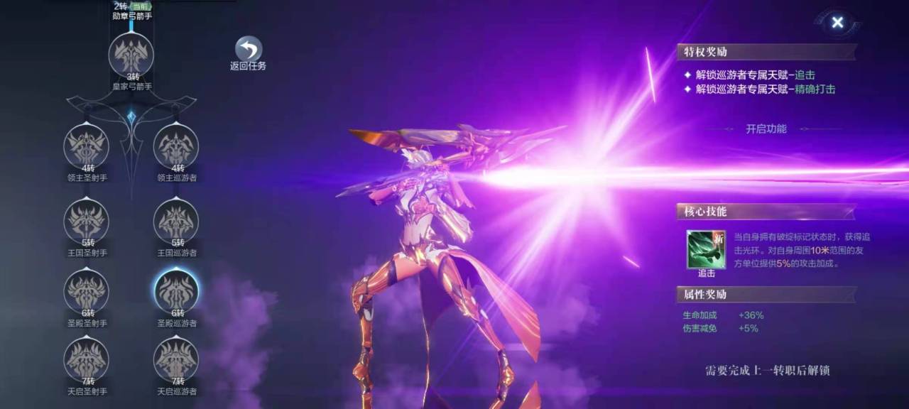 从两个分支的特殊技能来看,圣射手更加偏向辅助一些,在副本中作用可以更大一些,但是在其他的场合,都是巡游者的作用更大,而且更加偏向进攻属性,不仅自己输出高,还能提高全队输出,所以贡献更大一些,建议大家转职为巡游者比较好以下。