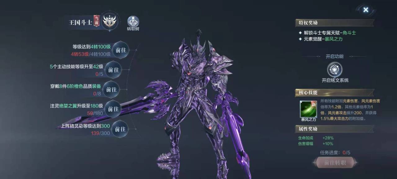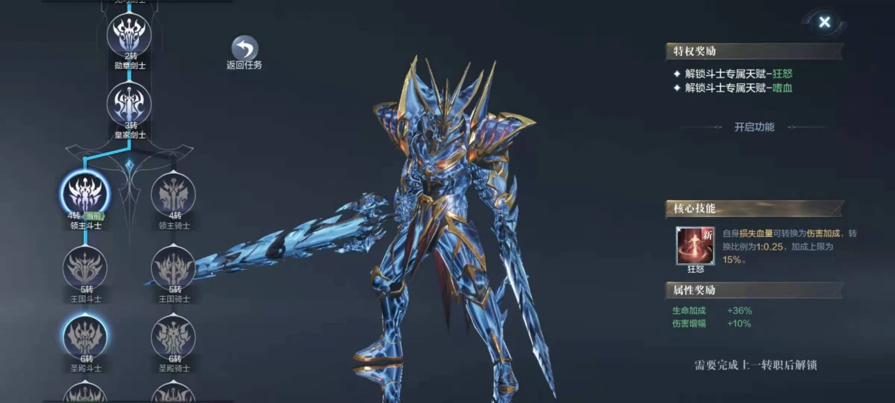 想要转职为领主斗士,需要先把剑士提升到4转等级,完成了转职任务之后就可以了,领主斗士的天赋角斗士就是可以双持武器。但是双持武器也是有限制的,必须是两把单手武器才行,如果是双手武器的话,是不能装备两把的。